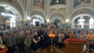 За богослужением были вознесены сугубые прошения о упокоении душ приснопамятных воинов, «за веру, Отечество и народ жизнь свою положивших, от ран и глада почивших, в пленении и горьких работах невинно умученных и убиенных, в блокаду скончавшихся и всех Победы ради потрудившихся».